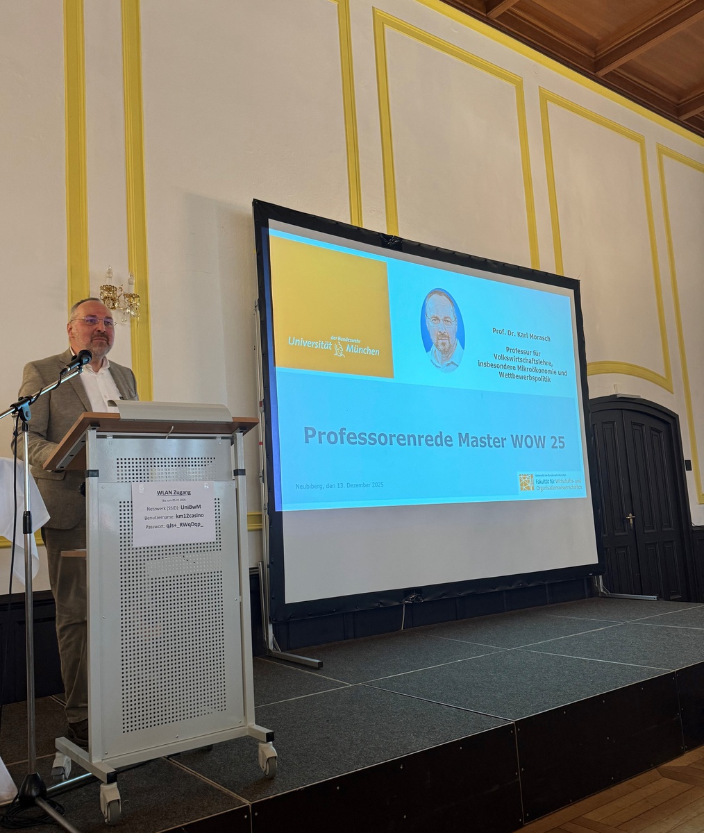 Im Rahmen der diesjährigen Fakultätsmasterfeier von WOW feierten wir gemeinsam mit rund 220 Gästen den erfolgreichen Studienabschluss unserer Absolventinnen und Absolventen im Uni Casino. Insgesamt wurden 57 WOW-Masterabschlüsse gewürdigt darunter 40 soldatische Absolventinnen und Absolventen und 17 Absolventinnen und Absolventen des ausbildungsintegrierten Studienganges (AIS). Ein zentraler Programmpunkt der Feier war die Professorenrede von Professor Morasch, der die Leistungen des Jahrgangs würdigte und den Absolventinnen und Absolventen Impulse für ihren weiteren Weg mitgab. Wir gratulieren den Absolventinnen und Absolventen und bedanken uns bei allen, die zum Gelingen der Feier beigetragen haben!
