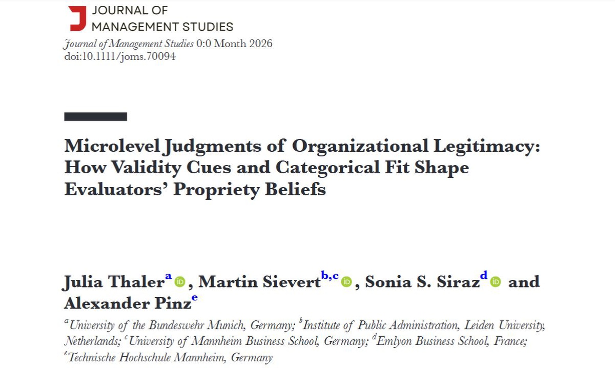 Wir freuen uns über die Veröffentlichung des Artikels „Microlevel Judgments of Organizational Legitimacy: How Validity Cues and Categorical Fit Shape Evaluators’ Propriety Beliefs“ von Julia Thaler gemeinsam mit Martin Sievert (Leiden University), Sonia S. Siraz (Emlyon Business School) und Alexander Pinz (Technische Hochschule Mannheim) im Journal of Management Studies.