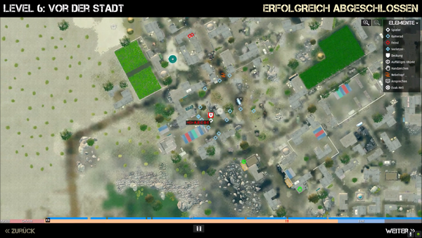 Taktischer Replay Mittels Vogelperspektive sieht der Spieler auf einer taktischen Karte den gegangenen Weg und relevante Aktionen in dem gespielten Level.